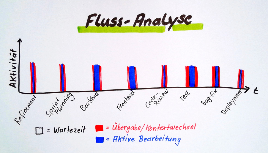 Auch wenn diese Art der Arbeitsorganisation vertraut erscheint und weit verbreitet ist, lohnt es sich, einen Blick auf alternative Arbeitsweisen zu werfen. Zunächst sollten wir jedoch die Auswirkungen der beschriebenen Arbeitsweise auf den Flow genauer betrachten – am besten anhand der sogenannten Fluss-Effizienz.